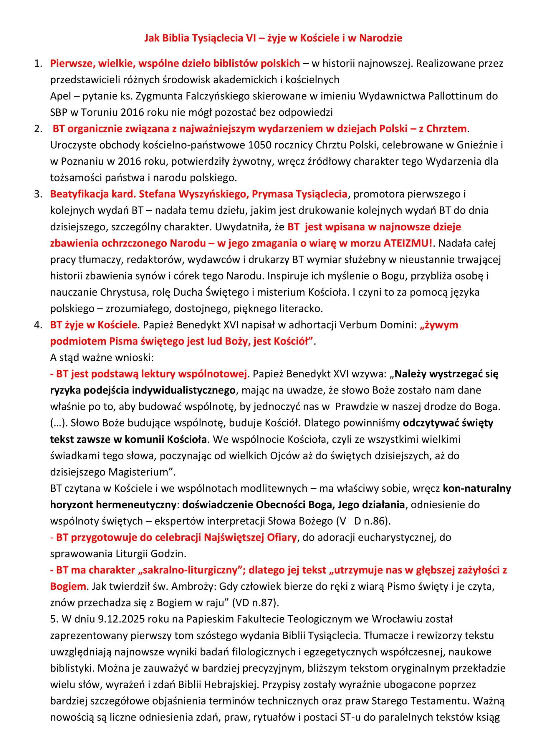 Podczas sympozjum w Papieskim Wydziale Teologicznym we Wrocławiu, w dn. 8-10.12.2025 r., prezes zarządu fundacji, ks. prof. dr hab. Henryk Witczyk – jako redaktor naczelny naukowej redakcji Biblii Tysiąclecia – dokonał uroczystej prezentacji pierwszego tomu: Biblia Tysiąclecia, Wydanie VI Studyjne, tom. I. Wygłosił także referat pt. „Biblia Tysiąclecia – żyje w Kościele i w ochrzczonym Narodzie”, w którym zwrócił uwagę na jej „sakralno-liturgiczny” charakter, wpływ na kulturę polską, na myślenie chrześcijańskie i moralno-patriotyczne, na szeroko rozumianą edukację i formację duchową młodych pokoleń Polek i Polaków. Szóste wydanie uwzględnia najnowsze wyniki badań w zakresie filologii i egzegezy biblijnej: polskiej i światowej, na bogate przypisy ukazujące organiczny związek ST i NT wg modelu – ciągłość, brak ciągłości i radykalna nowość Objawienia dokonanego przez Syna Bożego, Jezusa Chrystusa w Nowym Testamencie.