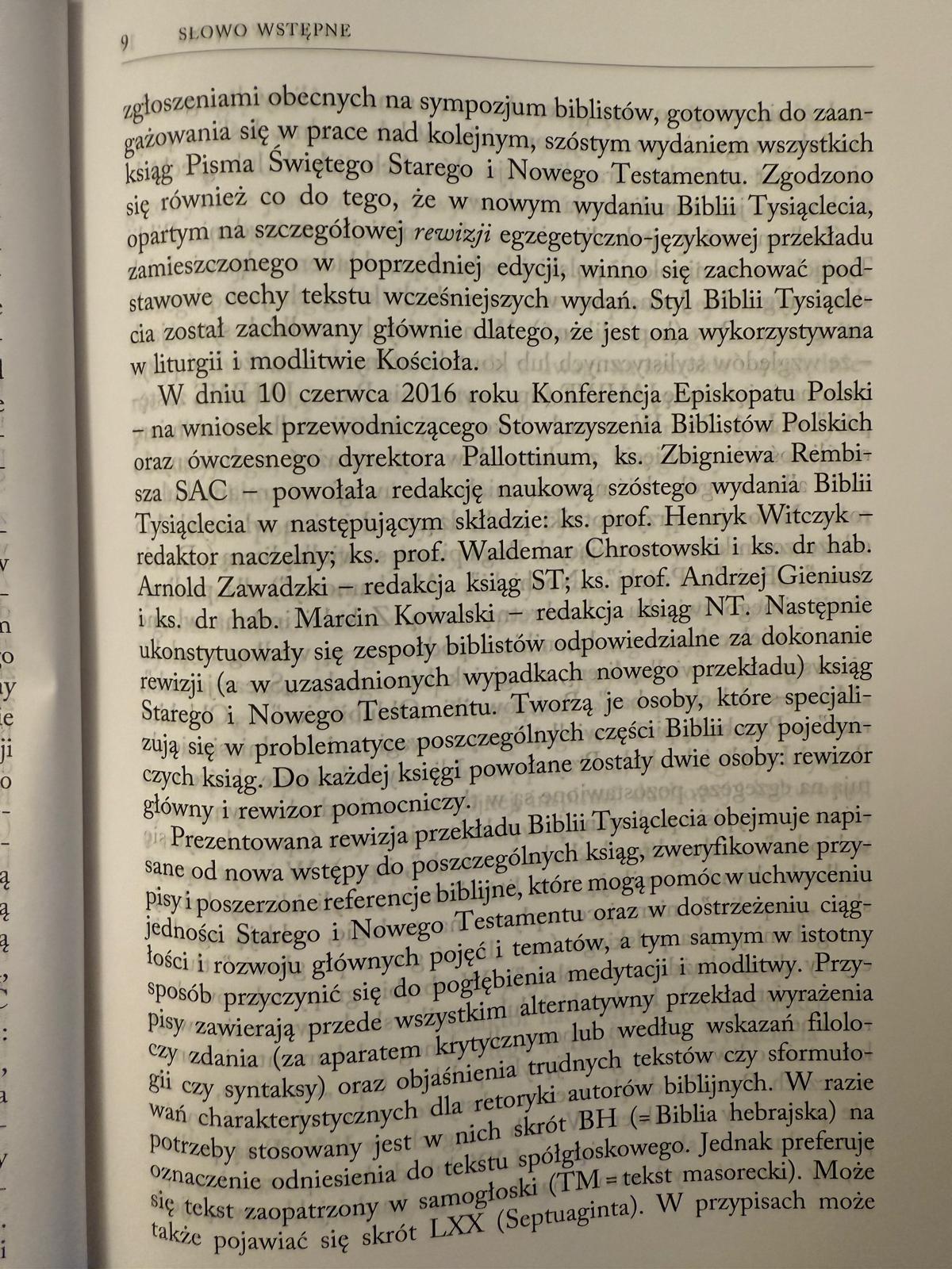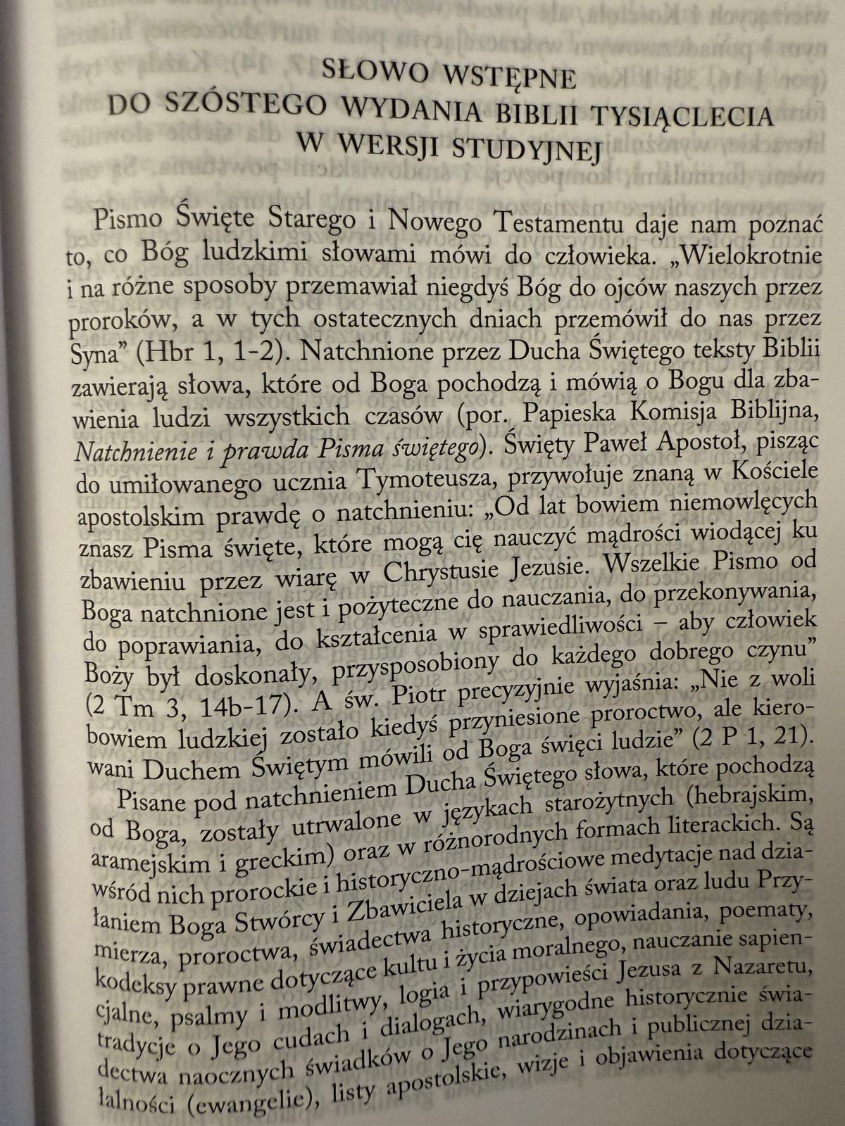We „Wstępie” do szóstego wydania Biblii Tysiąclecia ukazane zostały główne kryteria pracy rewizorów tekstu Biblii Tysiąclecia i Redakcji Naukowej tego wydania. W lekturę każdej księgi wprowadzają literacko-historyczno-teologiczne „Wstępy”. Przypisy analityczne, filologiczne i kanoniczne (referencje do NT), duży margines na osobiste refleksje i modlitwy. „Bierz i czytaj”! – przypomina się Głos, który mówił do młodego retora i filozofa szukającego Prawdy, jakim był Augustyn z Hippony. Słowo Boże przemieniło go w świętego, zachwyconego Prawdą i Miłością ofiarowaną mu – i każdemu człowiekowi dobrej woli – w Piśmie świętym.